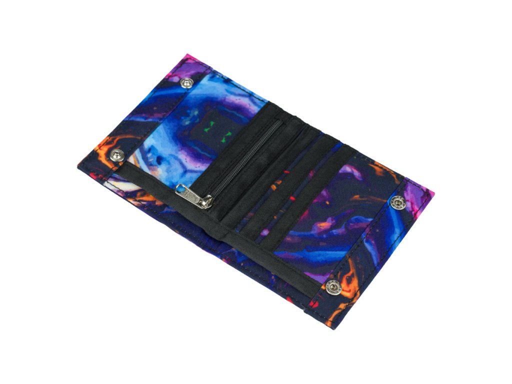 • Praktická menší peněženka uzavíratelná na 2 patentky.• Prostor na bankovky a kapsička na drobné uzavíratelná zipem.