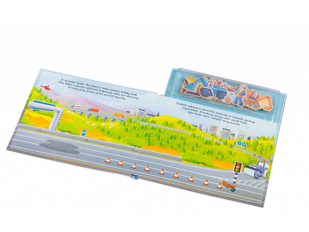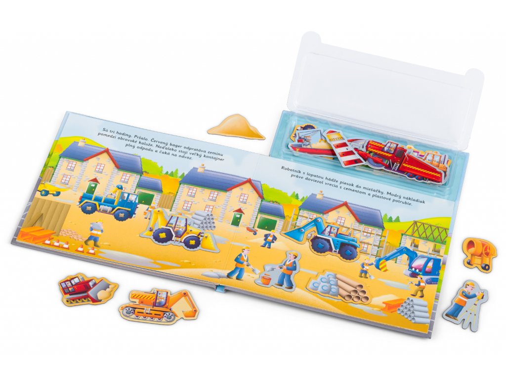 Na každé stránce téhle knížky objeví děti kratičký příběh, který mohou spoluvytvářet pomocí magnetek. A až si do sytosti vyhrají, mohou všechny stroje „zaparkovat“ zpátky do úložného boxu, kde budou připraveny na další zábavu.Kniha obsahuje 18 ks magnetek.
