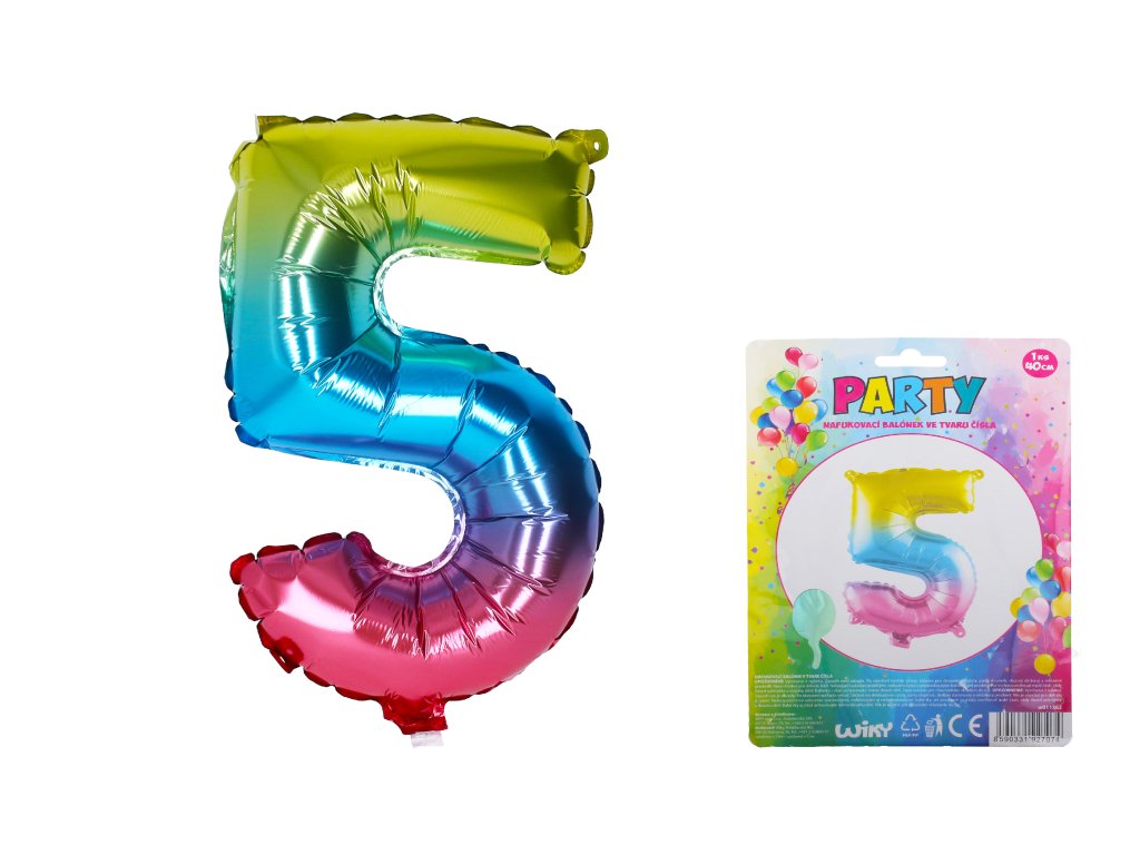 Duhový nafukovací balónek ve tvaru čísla 5 je vhodný jako doplněk na narozeninovou párty! Velikost: 40 cmDoplňkové parametry