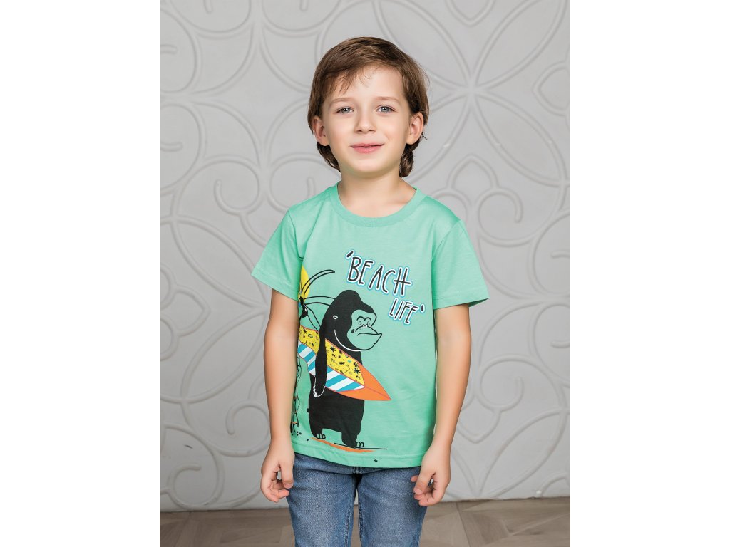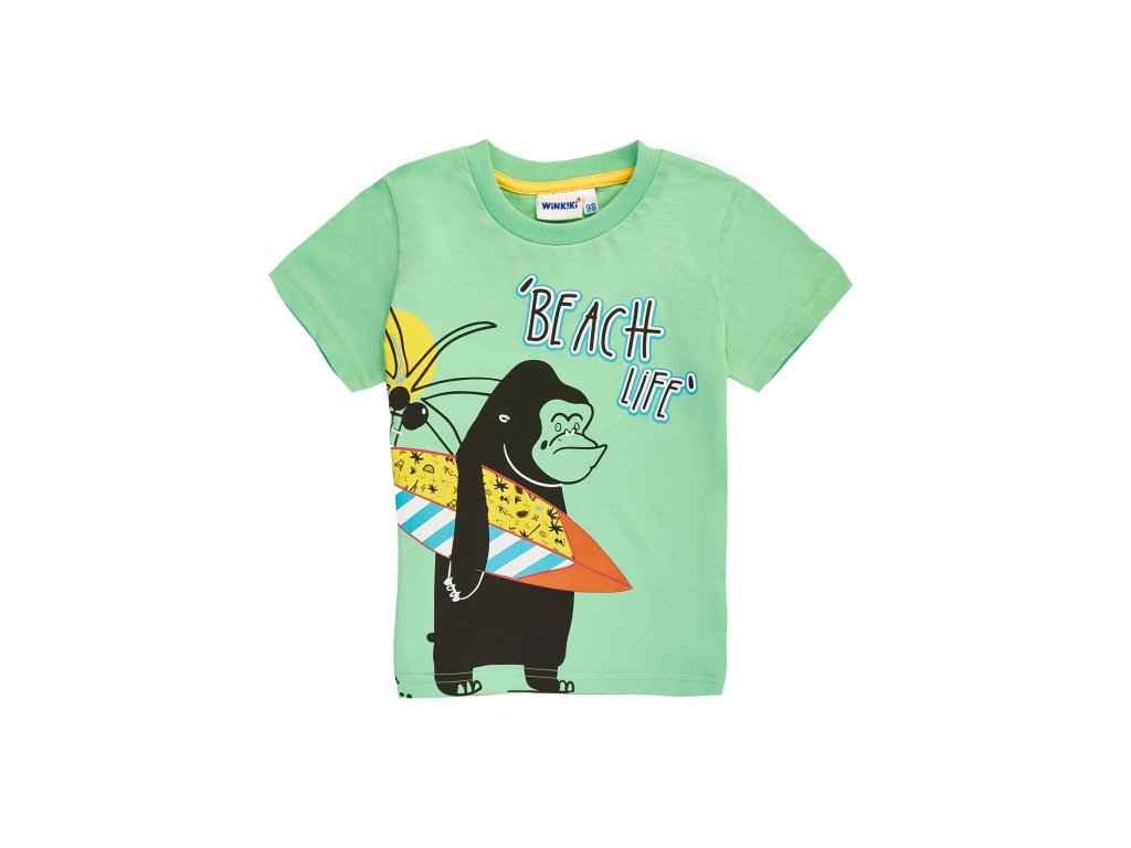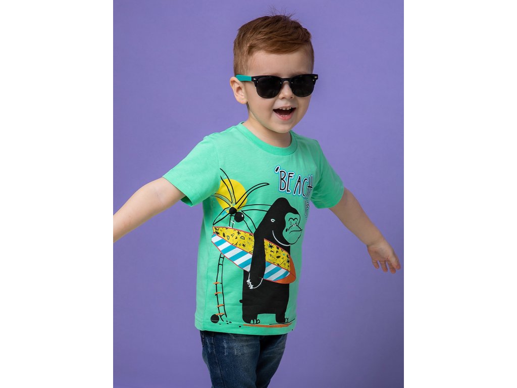 Chlapecké tričko Beach Life s krátkým rukávem v zelené barvě. Na přední straně je gorila se surfem - když může ona, tak my určitě také! Pocit léta se přímo nabízí. Kvalitní 100% bavlna. Velikosti 98 - 122. Vyrobeno v Uzbekistánu. Materiál: 100% bavlna. Látka: Supreme 150-160 gr. Návod k údržbě: Při praní se vždy řiďte pokyny uvedenými na štítku! Dostupné velikosti: 98 - 122. Barva: zelená.
