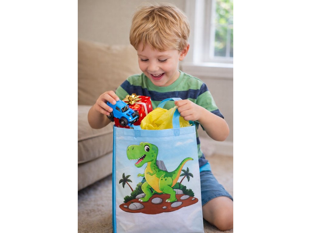 Praktická dárková taška s motivem dinosaurů ve velikosti 27 × 29 × 12 cm je ideální na narozeniny, dětské párty, školní akce i drobná překvapení. Veselé a barevné ilustrace pravěkých ještěrů zaujmou malé dobrodruhy a dodají každému dárku hravou atmosféru. Díky pevným uchům se taška pohodlně nosí a zvládne i těžší obsah.