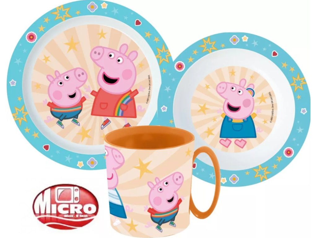 Vystrojte dětem úžasnou snídani a nejen tu, s prasátkem Peppa Pig. Jídelní set Peppa Pig díky hravým obrázkům zajistí chuť k jídlu klukům i holčičkám. Jídelní sada je vyrobena ze zdravotně nezávadného materiálu bez obsahu BPA (bisfenol A).