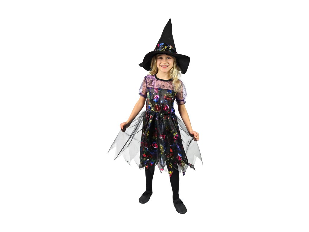Karnevalový kostým pro malé čarodějnice! Kostým černo-fialové barvy ve velikosti S je určen pro holčičky ve věkovém rozmezí 4-6 let. Šaty jsou dekorovány barevnými halloweenskými motivy. Součástí kostýmu je perfektně sladěný čarodějnický klobouk. S tímto úchvatným kostýmem se zaručeně staneš hvězdou karnevalu i Halloweenu!Doplňkové parametry