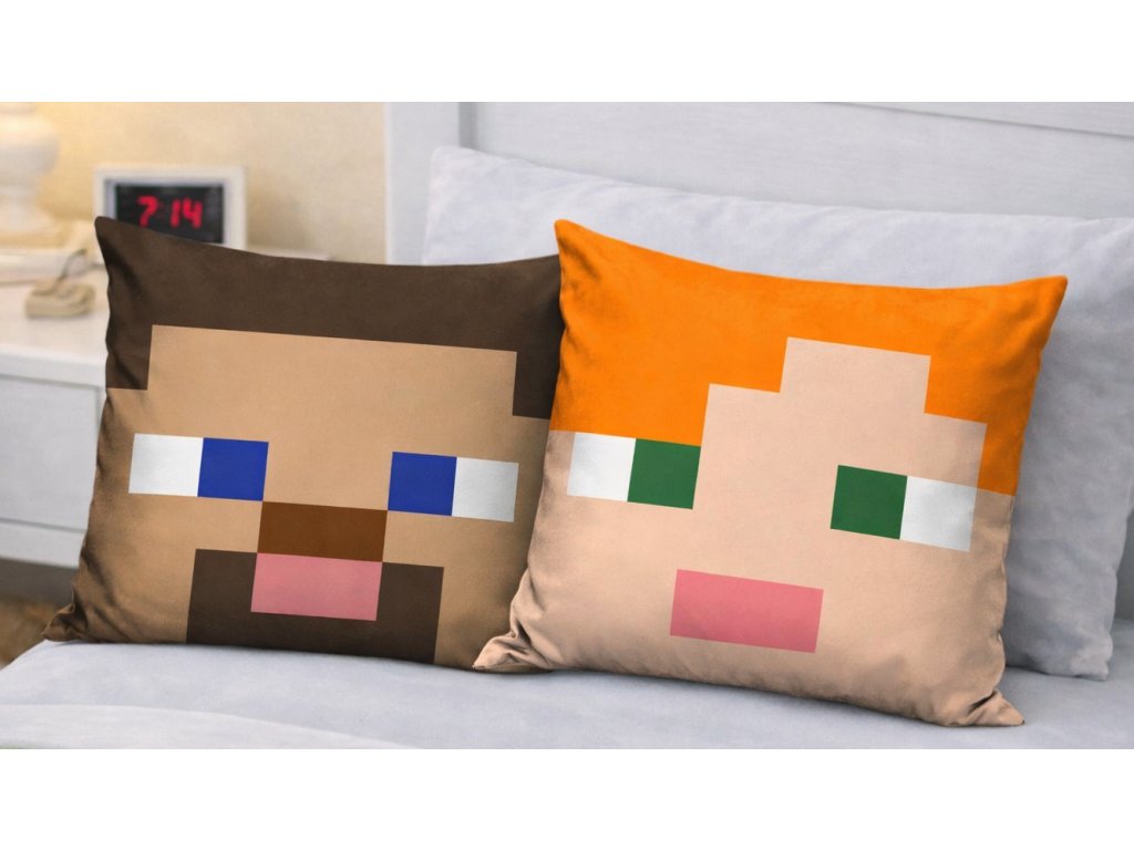 Na obou stranách polštářku jsou stylizované tváře herních postav vytvořené v typickém kostičkovaném designu. Jednoduché barevné bloky a výrazné oči připomínají ikonickou grafiku hry a okamžitě zaujmou.
