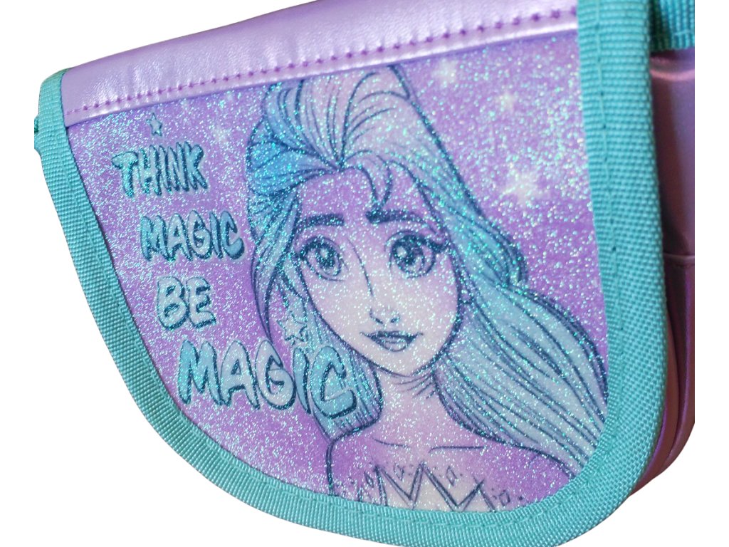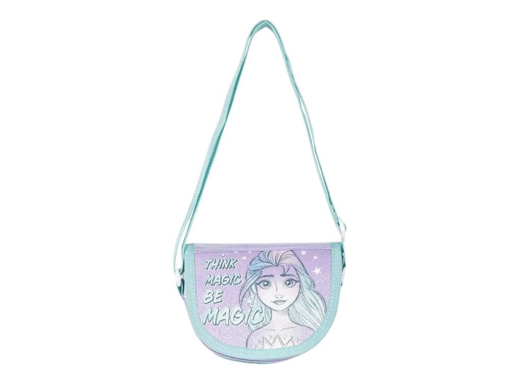 Dívčí kabelka s princeznou Elsou v nádherném tyrkysovofialovém provedení s třpytivým efektem. Kabelka má přezku přes rameno s regulací délky, vrchní klopu se zapínáním na suchý zip a uvnitř jednu velkou kapsu. Přední klopa je krásně třpytivá a to se holčičkám vždy moc líbí.