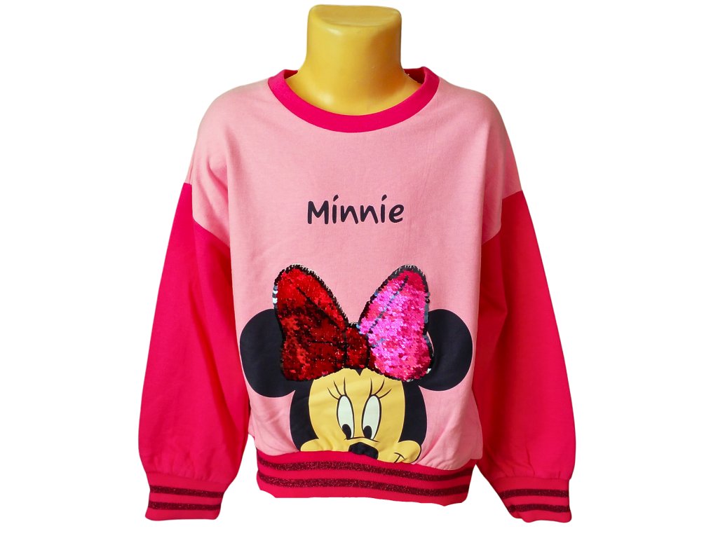 Krásná i praktická mikina s myškou Minnie a kouzelnou mašlí s měnícími se flitry. Barvu třpytivé mašle si holky určí samy, podle momentální nálady. Mikina je vhodná jako celoroční, je bez kapucky a tedy vhodná i pro vrstvení oblečení pod bundu. krásné a hlavně super pružné jsou i manžety, které zdobí třpytivá lurexová nitka. Na zadní straně je nápis Minnie se srdíčkem.