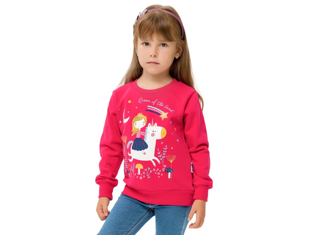 Dívčí zateplená mikina v malinové barvě s dlouhým rukávem a s princeznou jedoucí na jednorožci na přední straně. Konce rukávů i konec mikiny je ukončen elastickými lemy. Příjemný a teplý materiál. 100% bavlna. Velikosti 98 - 122. Vyrobeno v Uzbekistánu. Materiál: 100% bavlna. Látka: Footer (česaná teplákovina) 250-260 gr. Návod k údržbě: Při praní se vždy řiďte pokyny uvedenými na štítku! Dostupné velikosti: 98 - 122. Barva: malinová.Doplňkové parametry