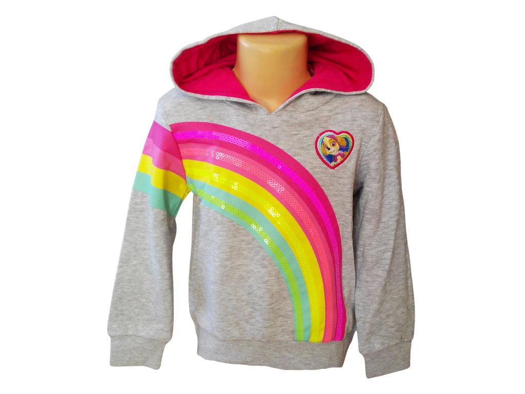 Nádherná mikina pro holky, kterou nebudou chtít sundat. Mikina Paw Patrol s duhou, která je tvořena barevnými flitry je luxusní kousek do dívčích šatníků. Tato jedinečná mikina je materiálově velmi příjemná, s vysokým podílem bavlny, rukávy i pas jsou ukončeny do pružných neškrtících manžet.