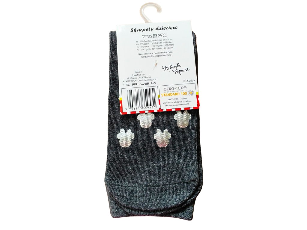 Dívčí ponožky s motivy myšky Minnie, které jsou zdobeny metalickými srdíčky. Ponožky jsou pružné a výborně se přizpůsobí, nespadávají ani neškrtí.