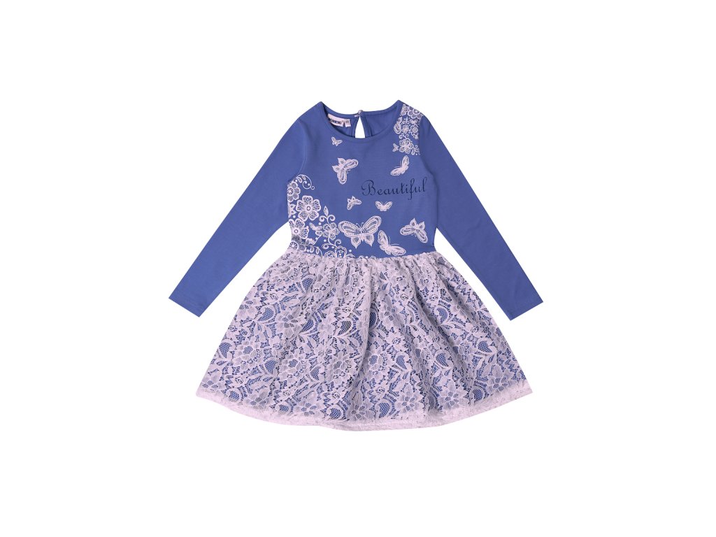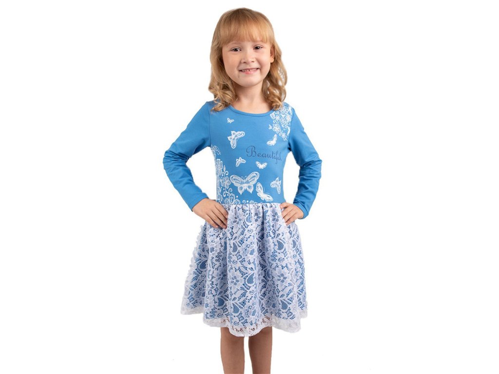 Dívčí šaty Beautiful s dlouhým rukávem v modré barvě s krajkovou bílou sukýnkou nad modrou látkou. Na přední straně jsou bílí motýlci a nápis Beautiful. Příjemný a pružný materiál. 95% bavlna a 5% elastan. Velikosti 98 - 122. Vyrobeno v Uzbekistánu. Materiál: 95% bavlna, 5% elastan. Látka: Supreme s elastanem 220 gr. Návod k údržbě: Při praní se vždy řiďte pokyny uvedenými na štítku! Dostupné velikosti: 98 - 122. Barva: modrá/bílá.Doplňkové parametry