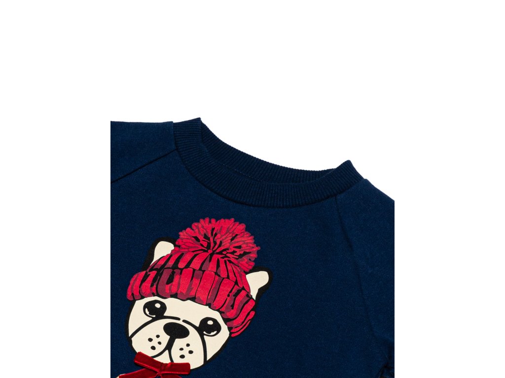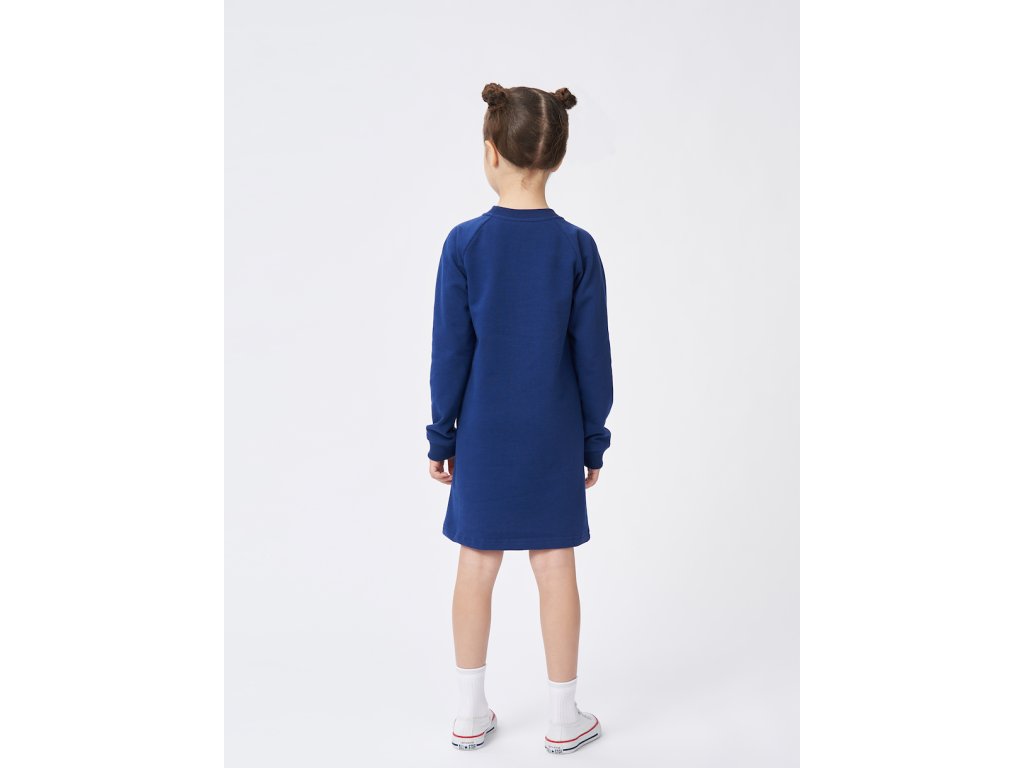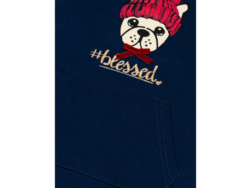 Dívčí šaty Blessed v tmavě modré barvě s nápisem 'Blessed', s pejskem a velkou kapsou na přední straně. Konce rukávů s elastickými lemy. Příjemný materiál s fleecem na vnitřní straně. 100% bavlna. Velikosti 98 - 122. Vyrobeno v Uzbekistánu. Materiál: 100% bavlna. Látka: Footer (česaná teplákovina) 250-260 gr. Návod k údržbě: Při praní se vždy řiďte pokyny uvedenými na štítku! Dostupné velikosti: 98 - 122. Barva: navy.Doplňkové parametry
