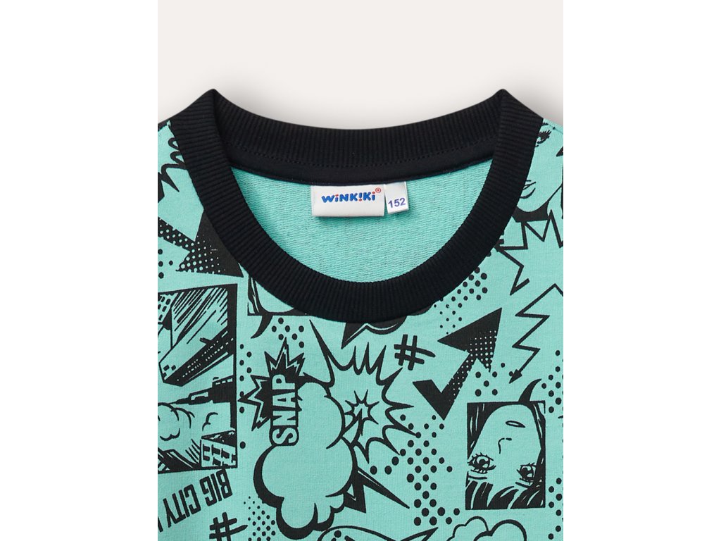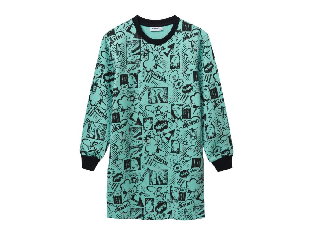 Dívčí šaty Comics z kolekce Comics. Barva tyrkysová. Délka šatů je nad kolena. V zimě krásně zahřejí. Na koncích rukávú a na spodní straně je pružný lem. Velikosti 140 - 164. Kvalitní zpracování. Materiál 100% bavlna. Vyrobeno v Uzbekistánu. Materiál: 100% bavlna. Látka: Footer nečesaná teplákovina 250 - 260 g. Návod k údržbě: Při praní se vždy řiďte pokyny uvedenými na štítku! Dostupné velikosti: 140 - 164. Barva: tyrkysová.Doplňkové parametry
