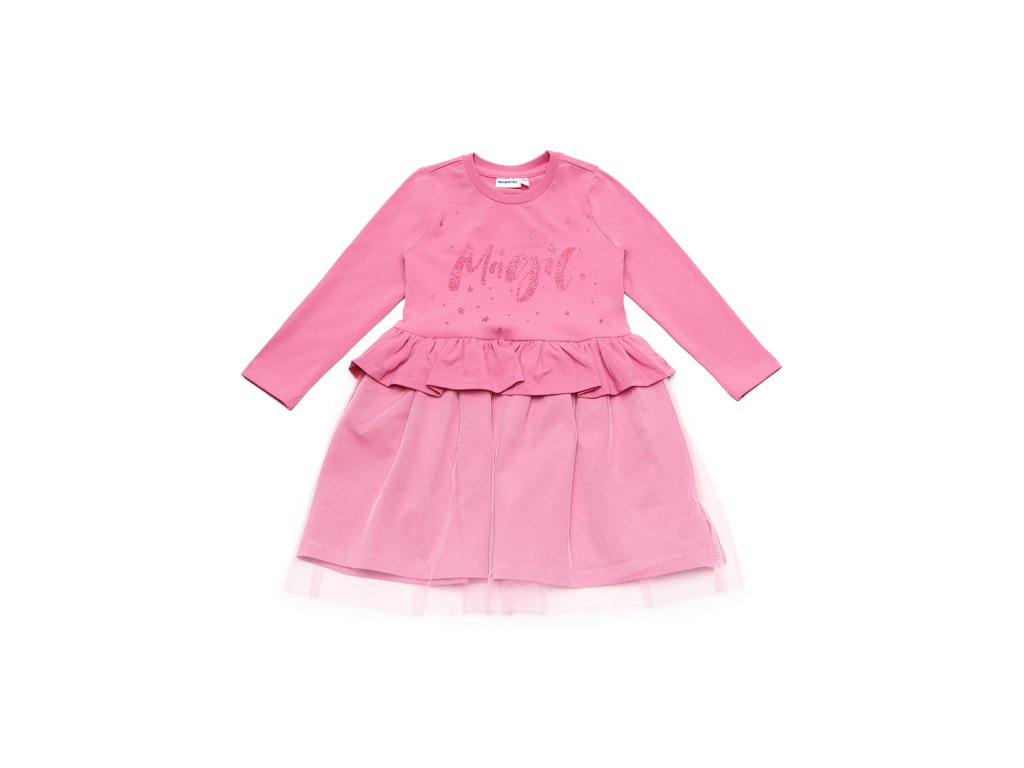 Dívčí zateplené šaty v růžové barvě s dlouhým rukávem a se sukýnkou. Na přední straně nápis Magic. Příjemný a teplý materiál. 100% bavlna. Velikosti 98 - 122. Vyrobeno v Uzbekistánu. Materiál: 100% bavlna. Látka: Footer (česaná teplákovina) 250-260 gr. Návod k údržbě: Při praní se vždy řiďte pokyny uvedenými na štítku! Dostupné velikosti: 98 - 122. Barva: růžová.Doplňkové parametry