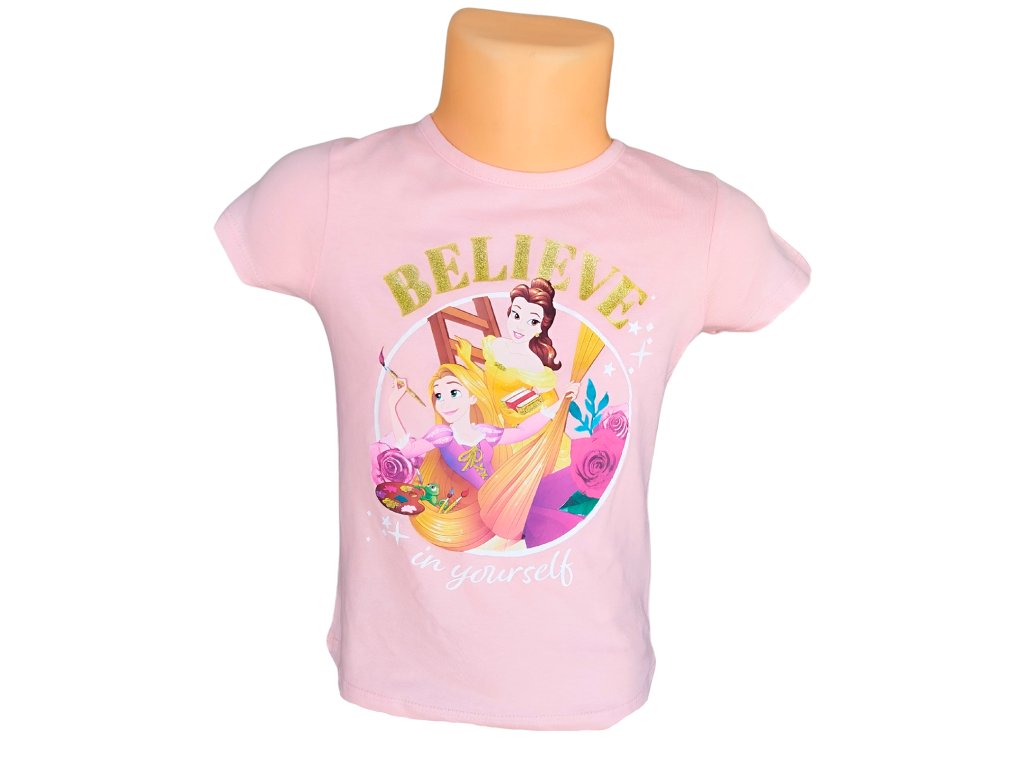 Bavlněné dívčí tričko s princeznami. Pohodlné tričko s krátkým rukávem, které je vhodné do školky i na doma, do města i na hřiště. Motiv je krásně přizdoben třpytkami.