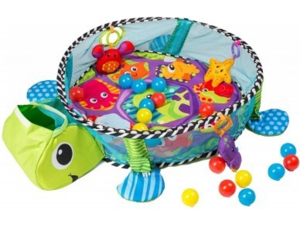 Hrací centrum želva. Balení obsahuje 12 ks míčků, 4ks závěsné textilní hračky. Hlava želvy je otevírací a slouží k uschování míčků.