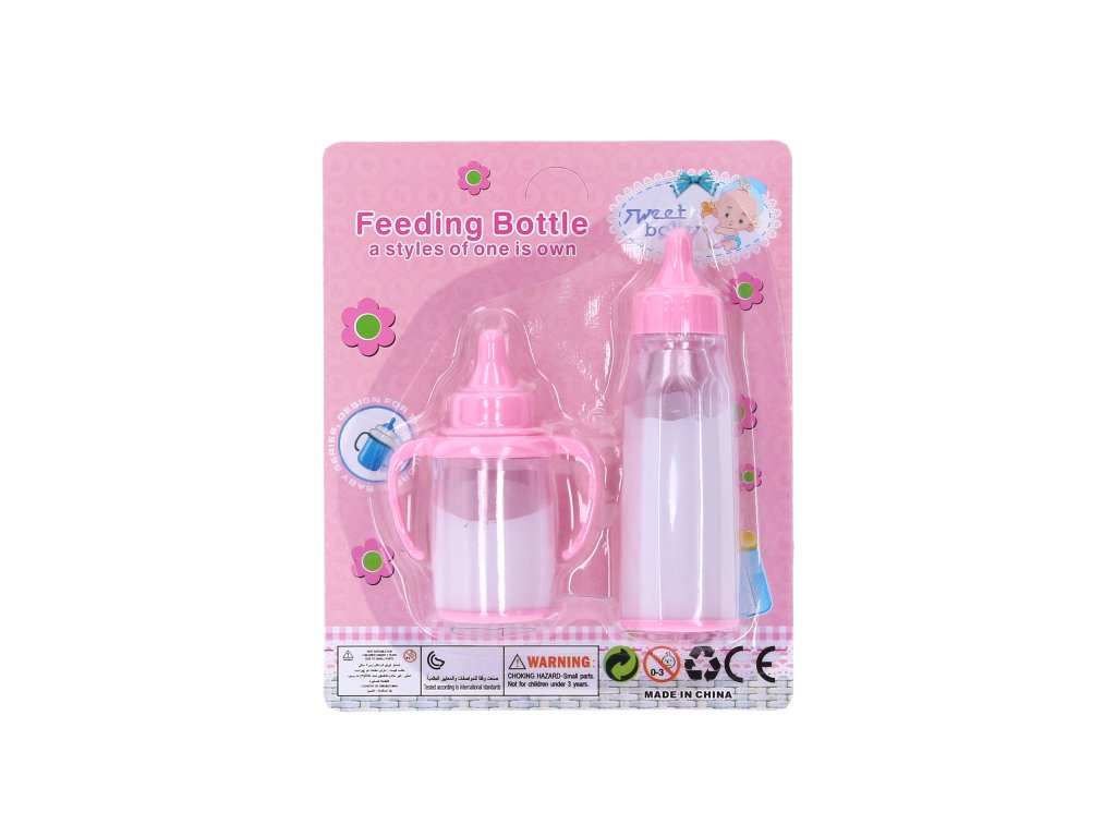 Láhve pro panenku 2 ks. Každé miminko potřebuje dokonalou výbavičku, tak nezapomeňte na lahvičky s mlíčkem. Tato krásná sada obsahuje 2 kojenecké lahve pro miminka, každá v jiném desingu a velikosti.