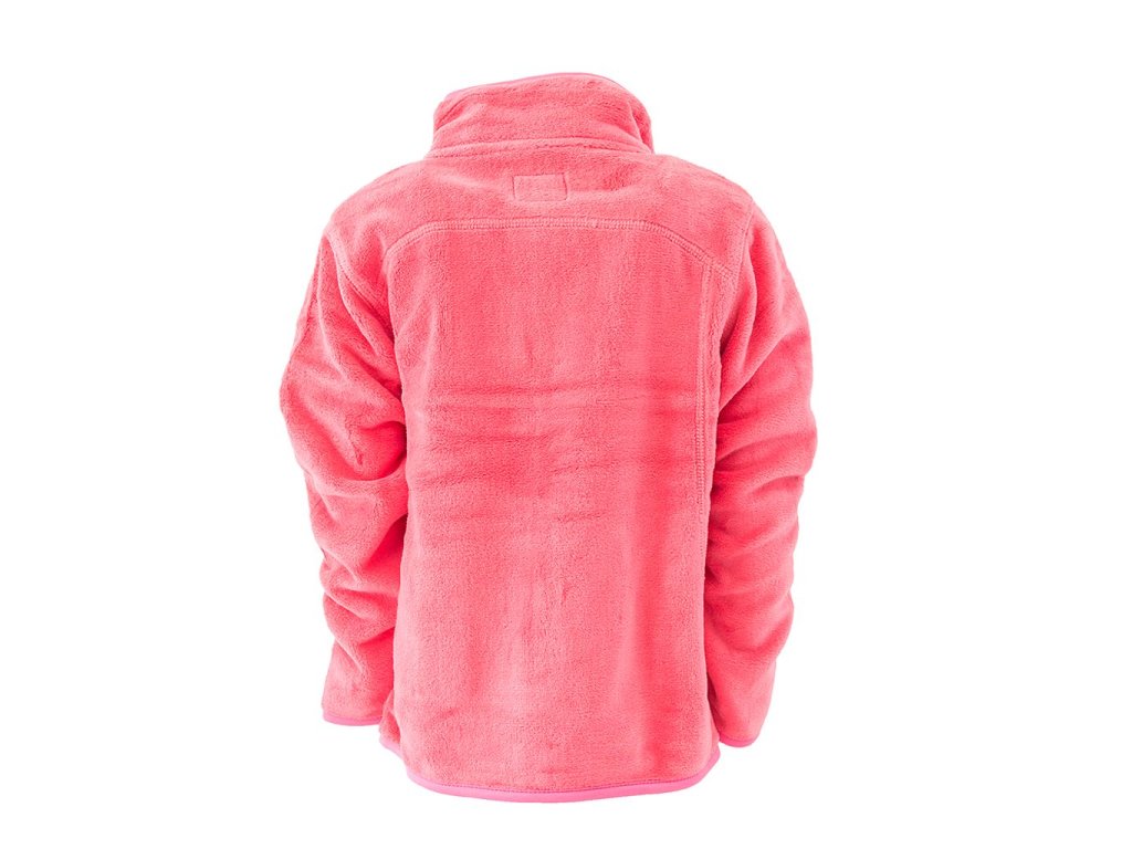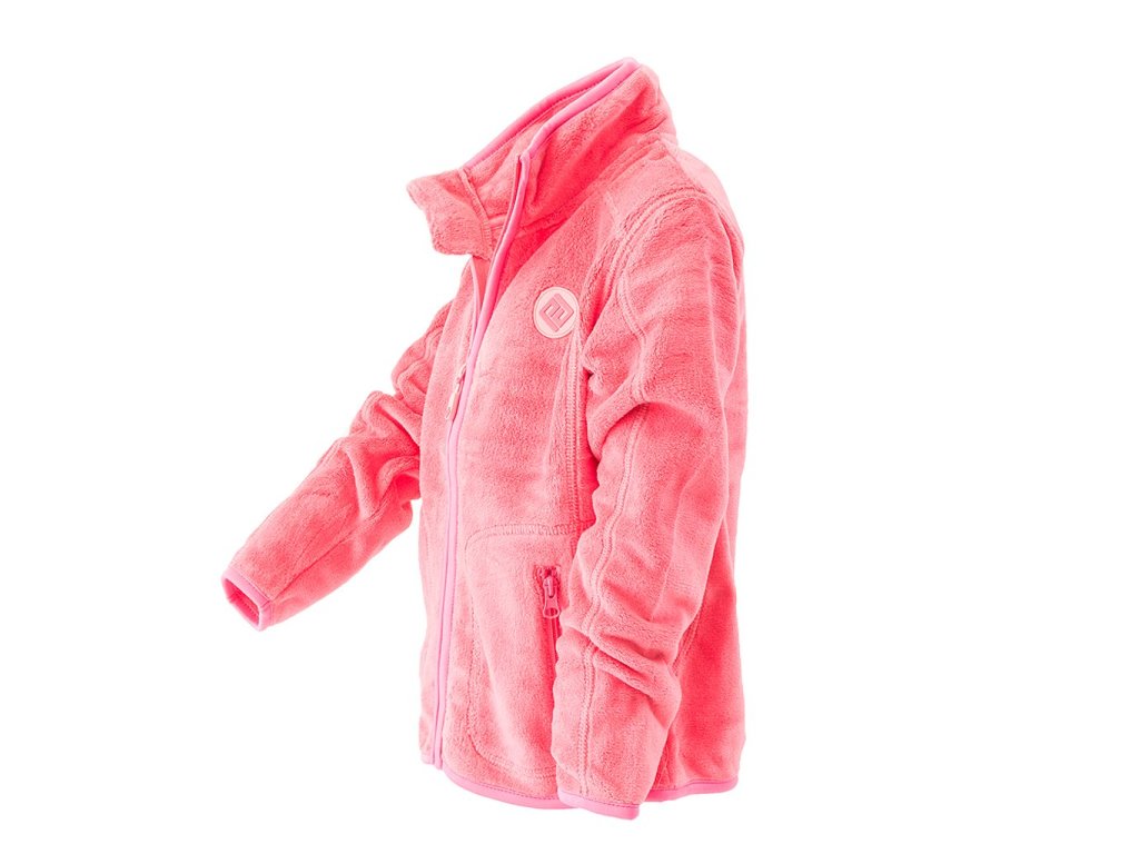 Dětská dívčí propínací chlupatá mikina v růžové barvě. Stojací límec, dvě kapsy, barevné kontrastní lemy.