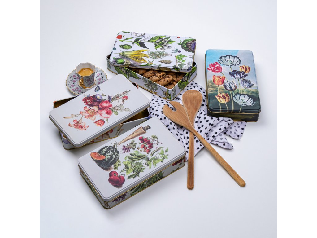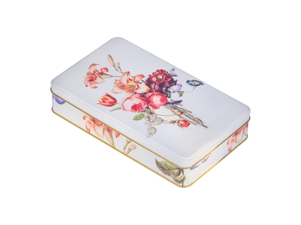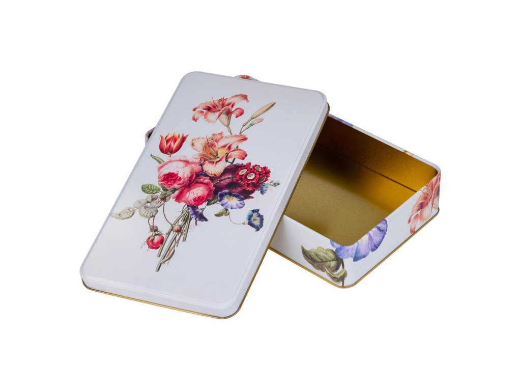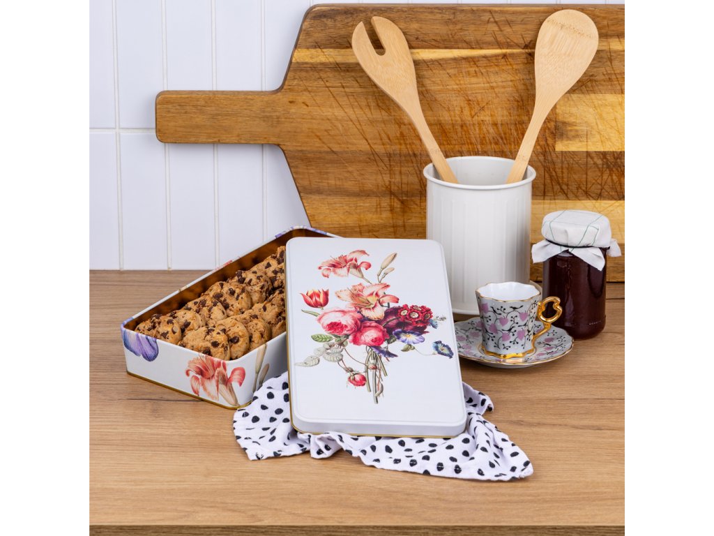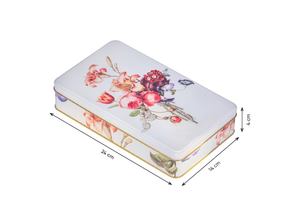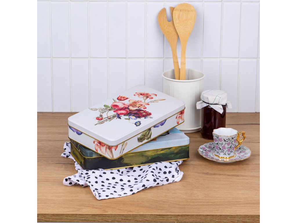 Stylová plechová dóza z s vyobrazením květin má všestranné praktické využití. Můžete do ní uložit sladkosti, cukroví či jiné potraviny, nejrůznější poklady a další domácí drobnosti. Dóza je vyrobena ze 100% oceli s cínovou vrstvou.Doplňkové parametry