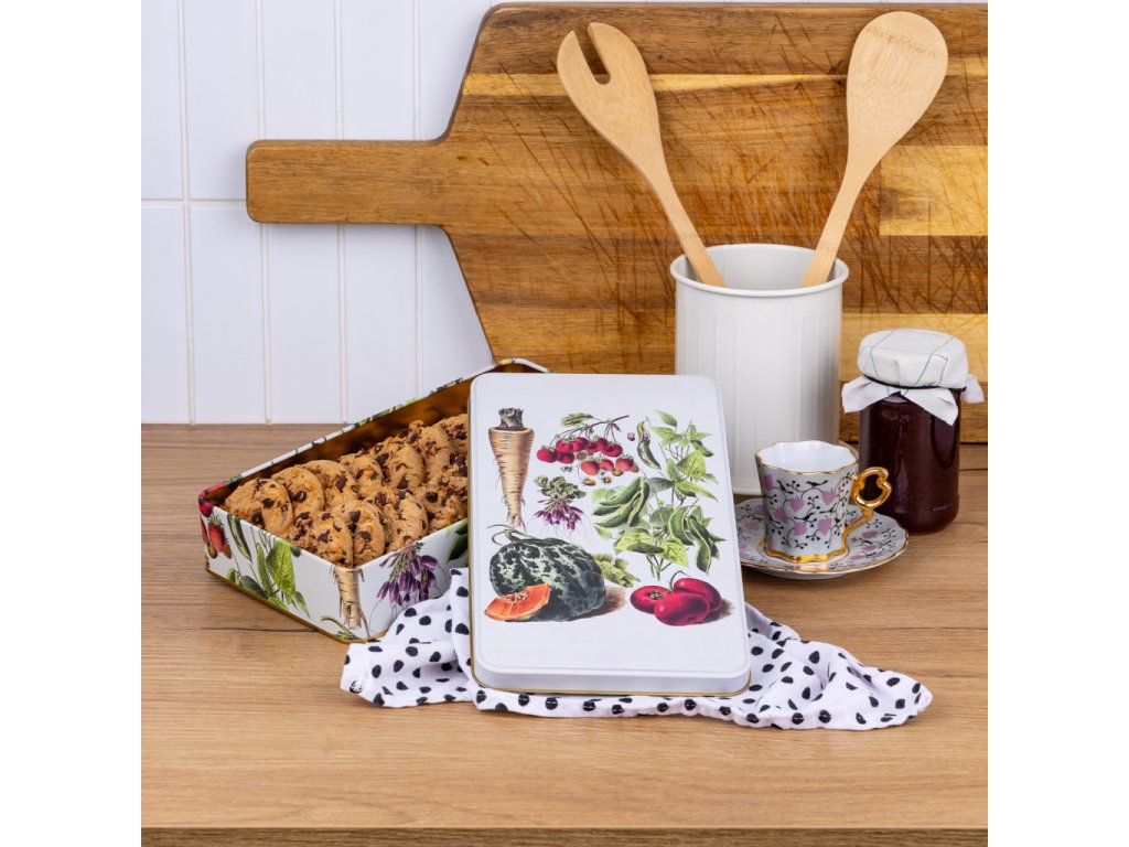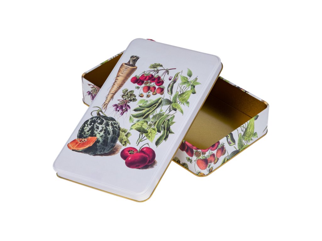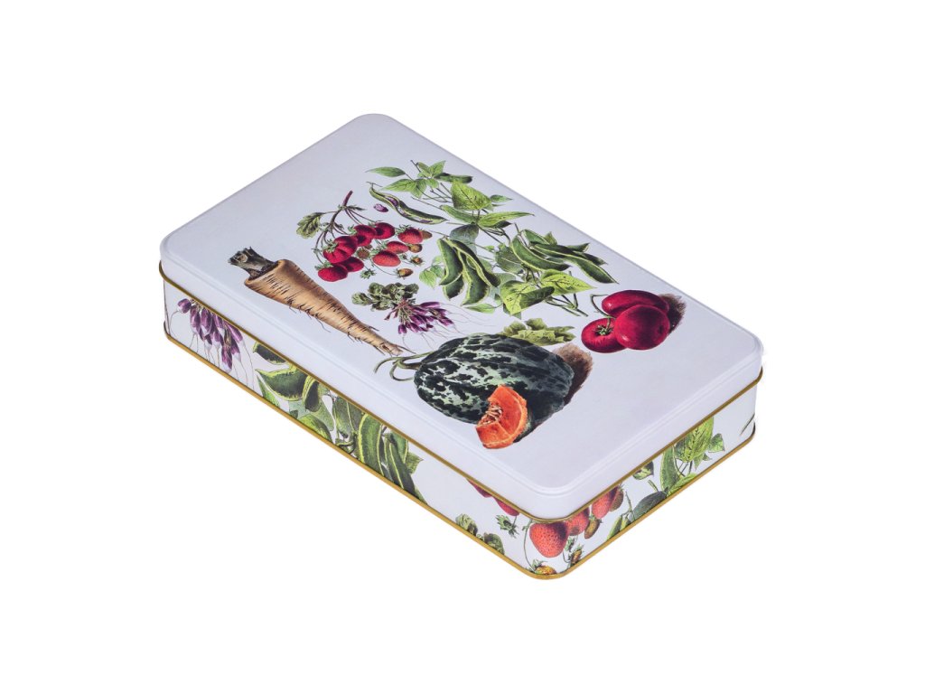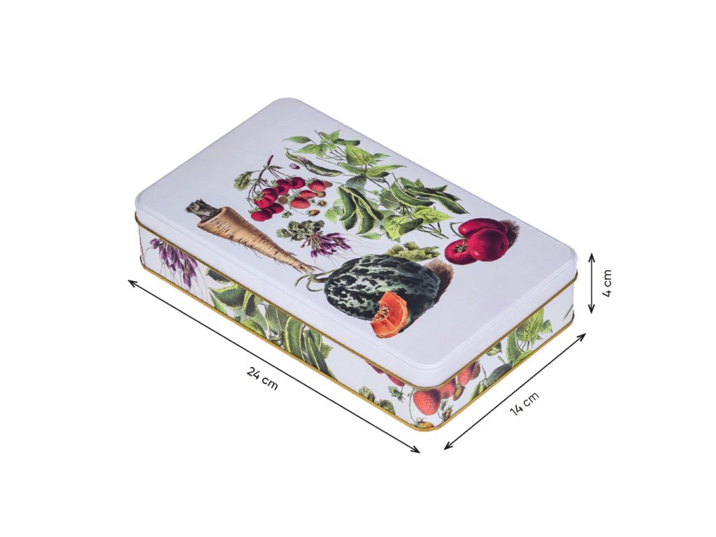 Stylová plechová dóza z s vyobrazením ovoce a zeleniny má všestranné praktické využití. Můžete do ní uložit sladkosti, cukroví či jiné potraviny, nejrůznější poklady a další domácí drobnosti. Dóza je vyrobena ze 100% oceli s cínovou vrstvou.Doplňkové parametry