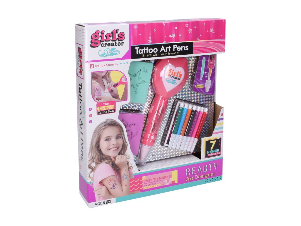 Tetovací studio set. Obsah balení - sada 8 šablon, 7 fixů, elektrické tetovací pero. Fixy jsou omyvatelné. Pero - 2xAAA, nejsou součástí.Doplňkové parametry