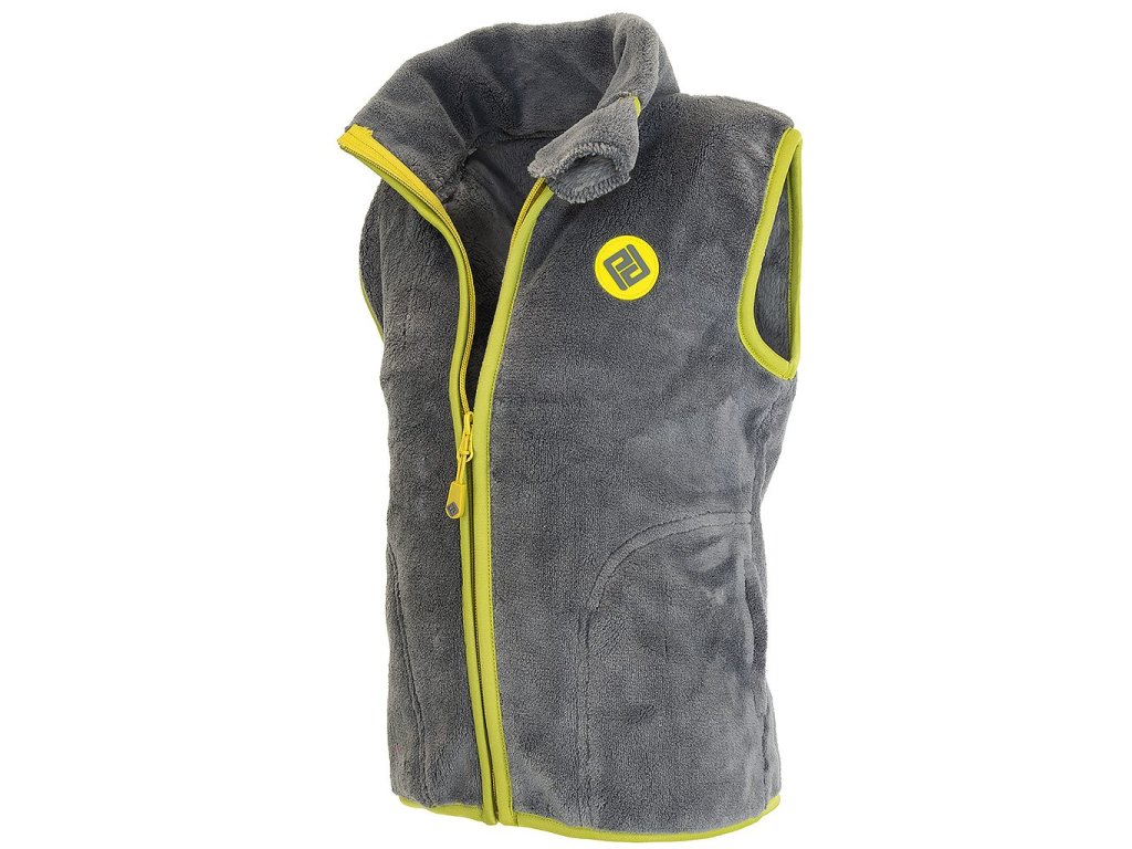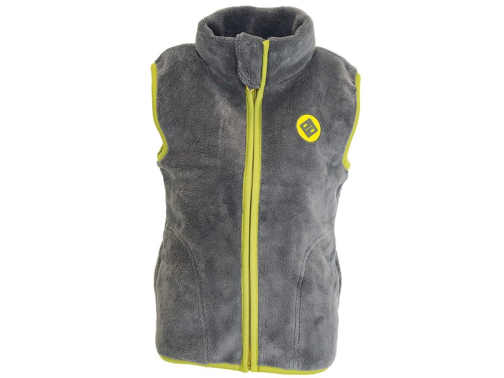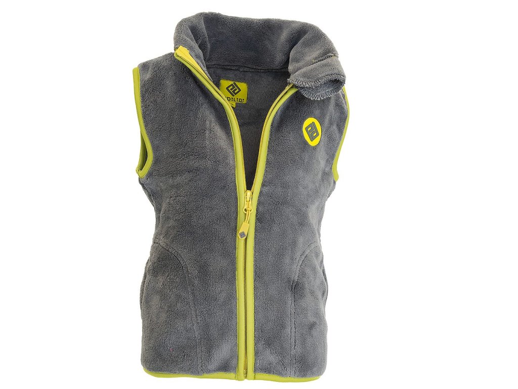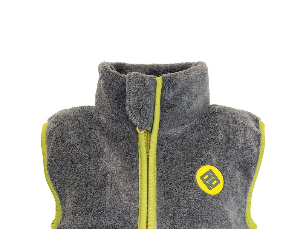 Dětská propínací chlupatá vesta v šedé barvě. Stojací límec, dvě kapsy, barevné kontrastní lemy.