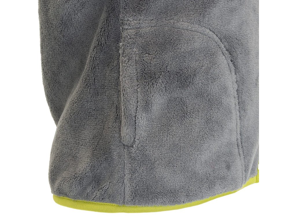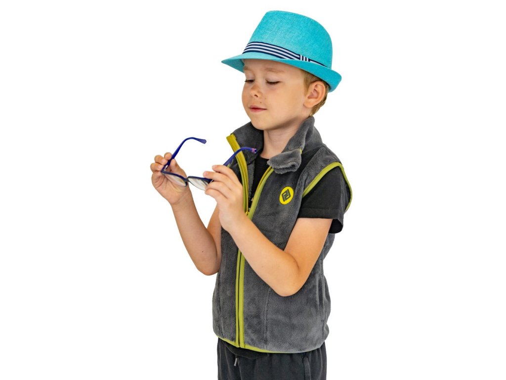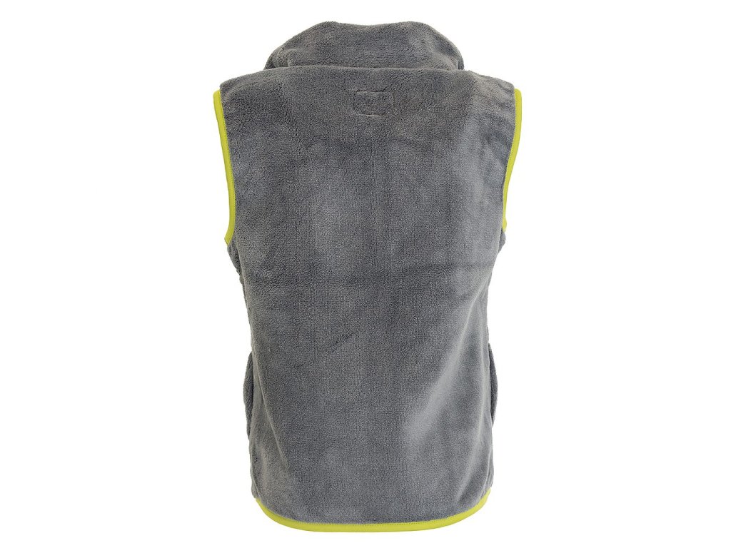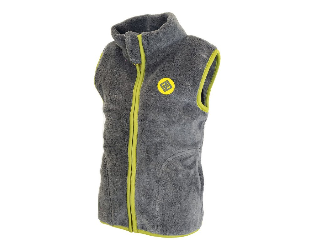 Dětská propínací chlupatá vesta v šedé barvě. Stojací límec, dvě kapsy, barevné kontrastní lemy.