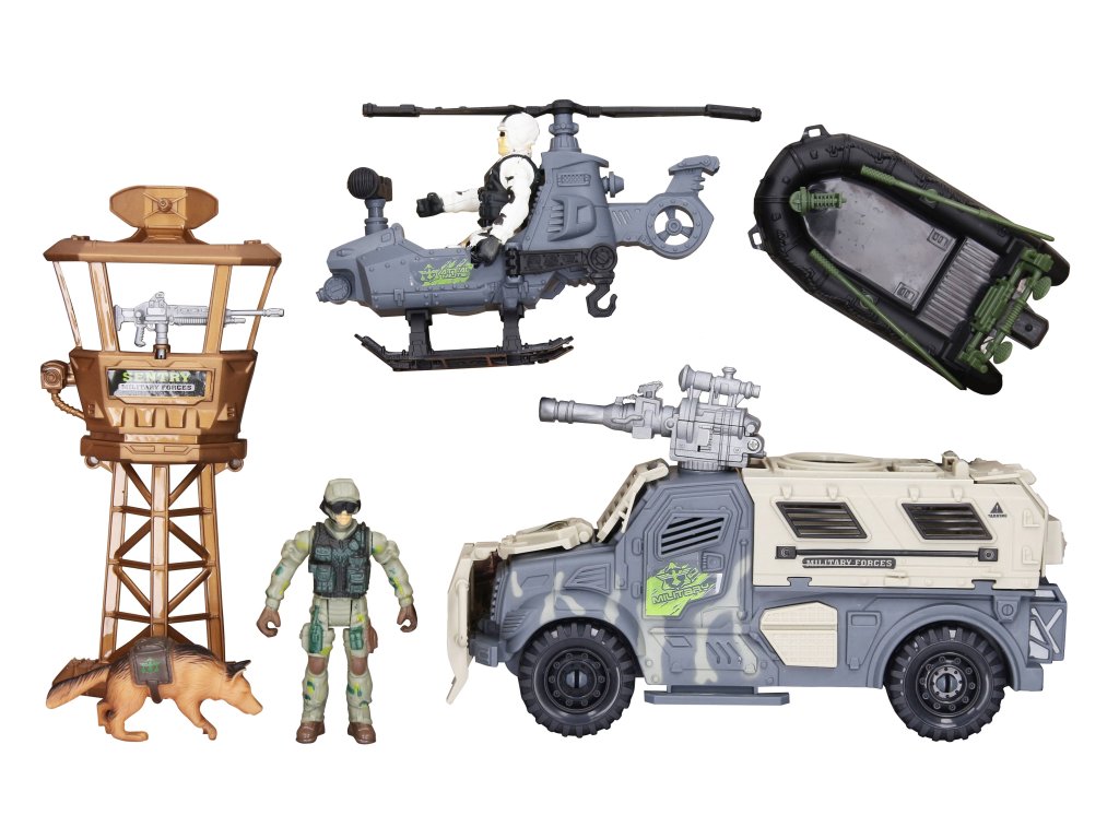 Vojenský set s figurkami a efekty. Velikost vozidla 25 cm, vojáka 10 cm. Volná kola. Světelné a zvukové efekty tlačítkem na zbrani na vozidle. 3xAG13 baterie do zbraně na vozidle. Obsah - vozidlo, vrtulník, člun, věž, zbraně, pes, 2 figurky vojáků.Doplňkové parametry