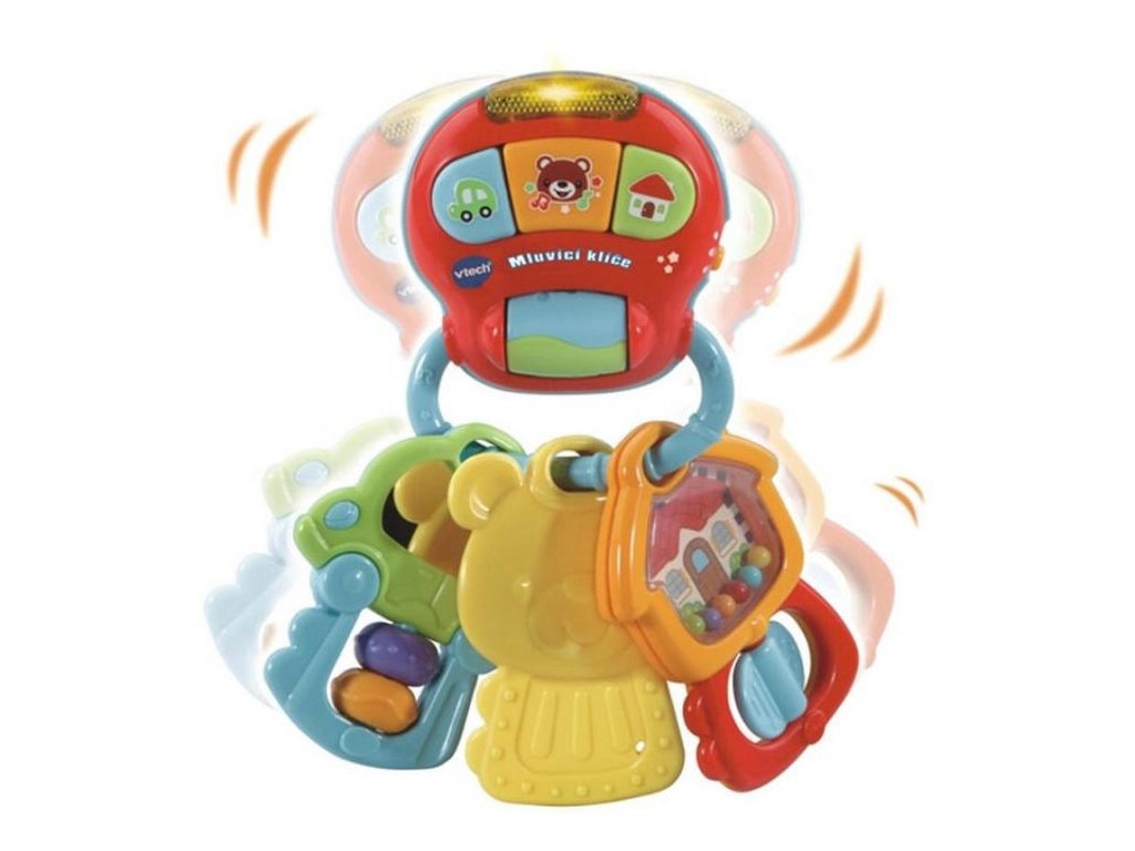 Interaktivní hračka vhodná pro miminka již od narození. Mluvící klíče zaujmou především zvukovými efekty, milými melodiemi a písničkami. Klíče slouží i jako „kousátko“ pro masírování dásní dítěte, tak aby první zoubky moc nebolely. Blikající světýlko a kutálející se korálky přitahují pozornost dítěte a rozvíjí stimulaci očí. aktivace pohybem nebo tlačítky mluví česky rozvíjí jemnou motoriku snadné uchopení baterie součástí Doporučený věk: 0+Doplňkové parametry