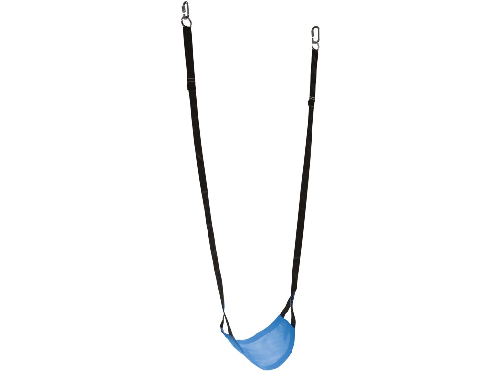 Dětská modrá houpačka, vyrobená z nylonových a polyesterových vláken. Houpačka je prodyšná neklouzavá a odolná. Je skladná a snadno se přenáší. Kovová spona umožňuje přizpůsobení délky lana podle velikosti dítěte.Doplňkové parametry